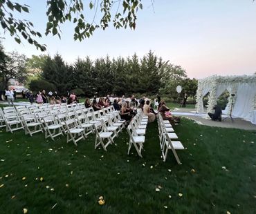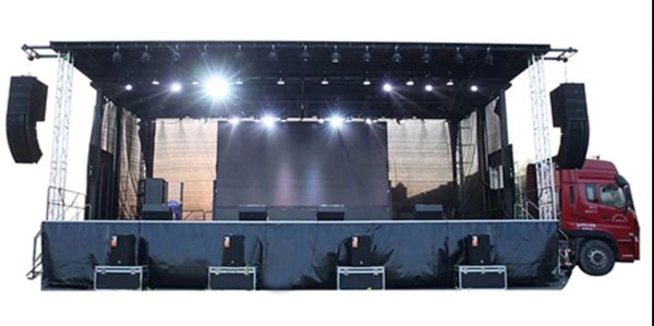 These stages are brought into a park or open lot area for concerts. They are typically much higher for a large crowd to see the performer.